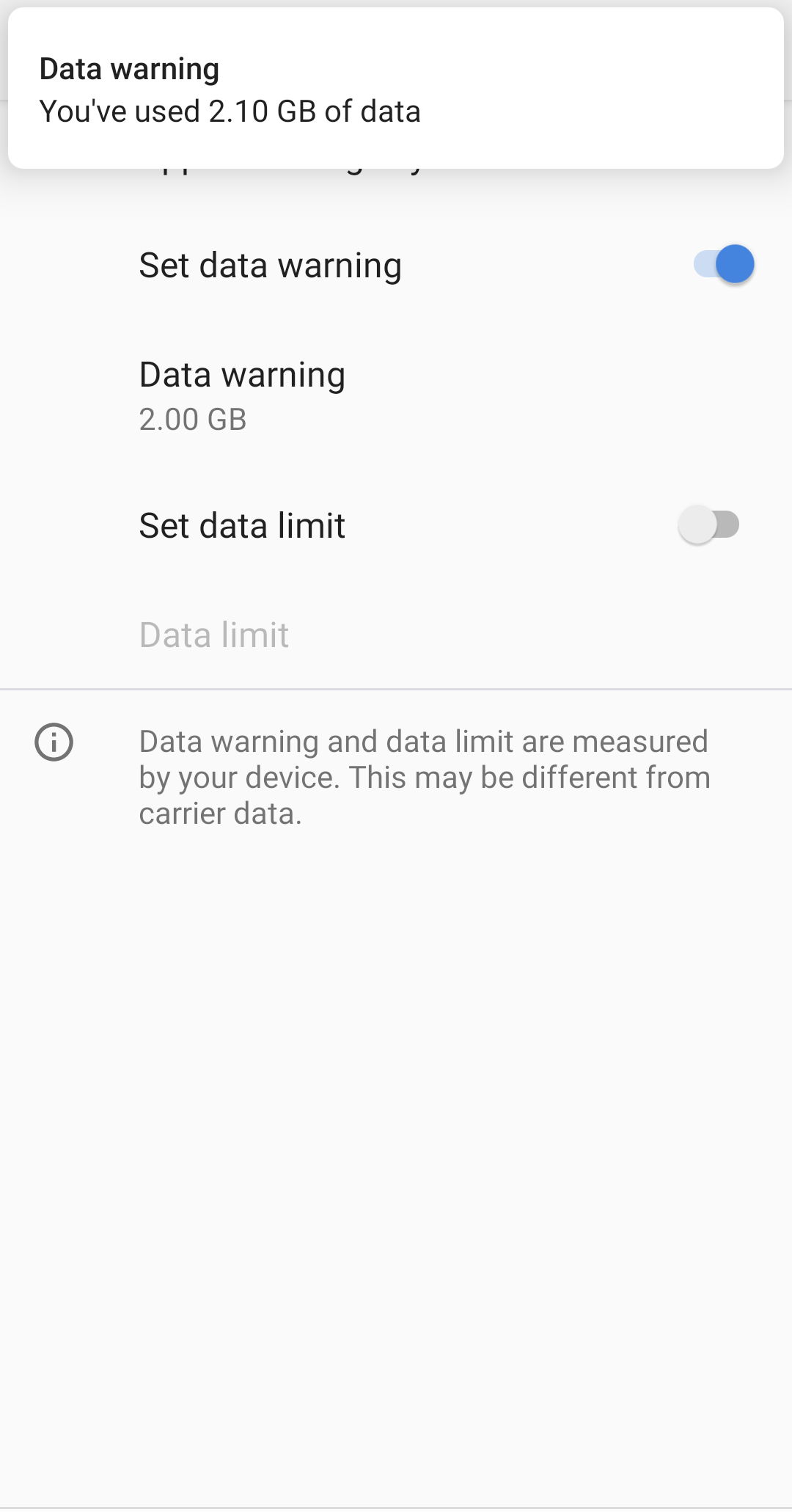 - From there, go to “Data warning & limit” and finally to “Set data warning.” There you can set a flag warning to say 2GB below your limit.